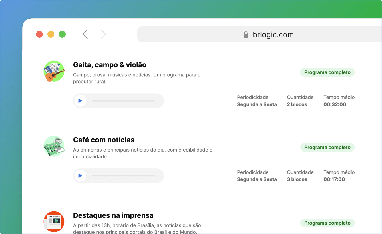 Saiba maisComplemente a grade de programação da sua rádio com vinhetas, campanhas, programetes e programas completos de até 2 horas de duração.