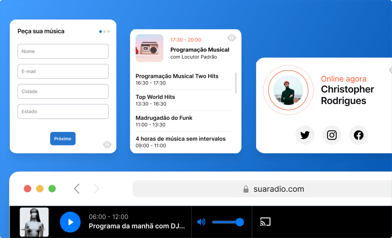 Saiba maisCrie e incorpore um player personalizado para a sua rádio. Adicione também widgets com recursos incríveis como sala de bate papo, mural de recados e muito mais.